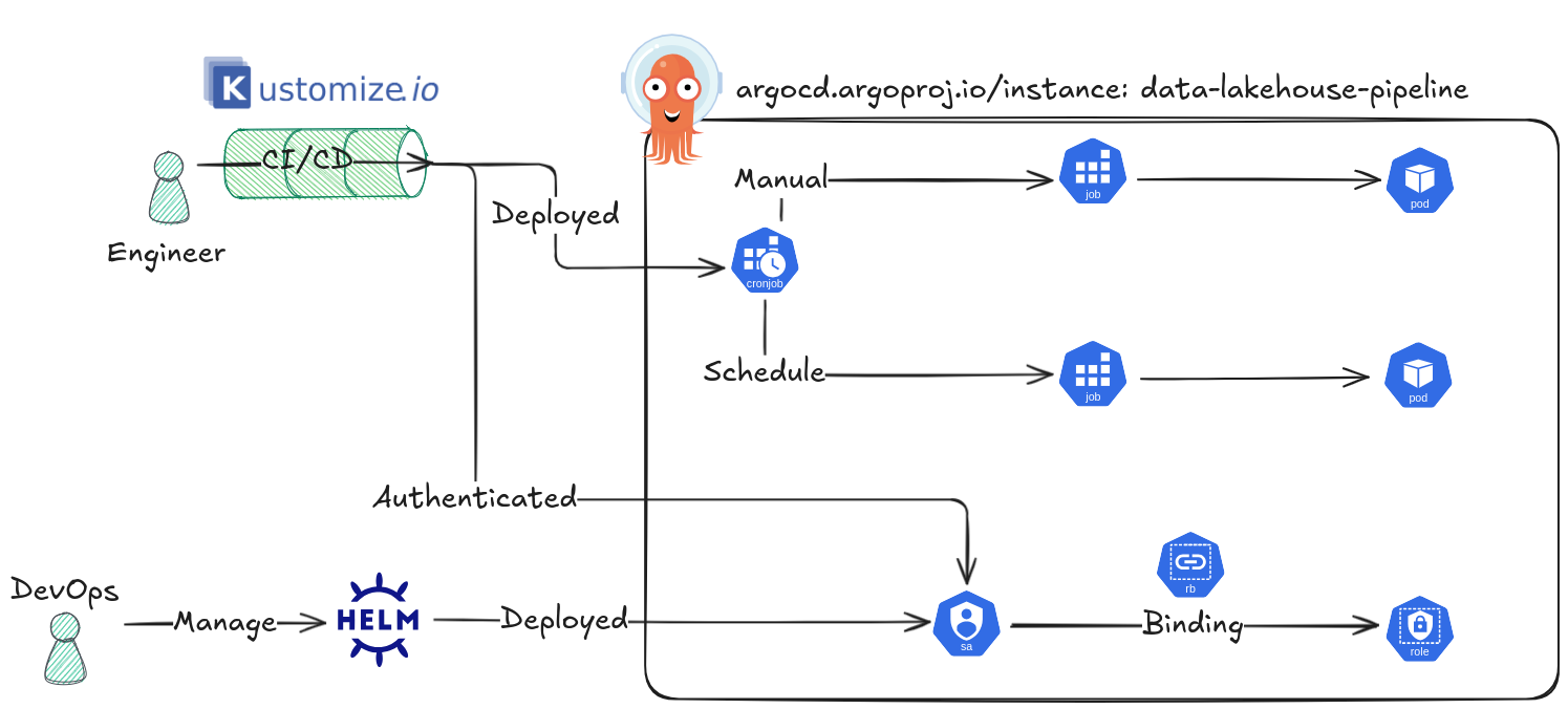 This role is responsible for establishing the secure foundation and access control necessary for the Data Engineers to manage their pipelines natively within Kubernetes. Provisioning is handled via ArgoCD Application (GitOps) and involves the following critical components: