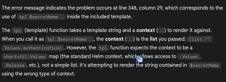 template: polaris/templates/deployment.yaml:130:12: executing "polaris/templates/deployment.yaml" at <include "polaris.configVolume" .>: error calling include: template: polaris/templates/_helpers.tpl:179:10: executing "polaris.configVolume" at <include "polaris.configVolumeAuthenticationOptions" (list "" .Values.authentication)>: error calling include: template: polaris/templates/_helpers.tpl:348:29: executing "polaris.configVolumeAuthenticationOptions" at <.>: wrong type for value; expected chartutil.Values; got []interface {} Use --debug flag to render out invalid YAMLThis error relate when calling the template via include and parsing the context (dot or . )