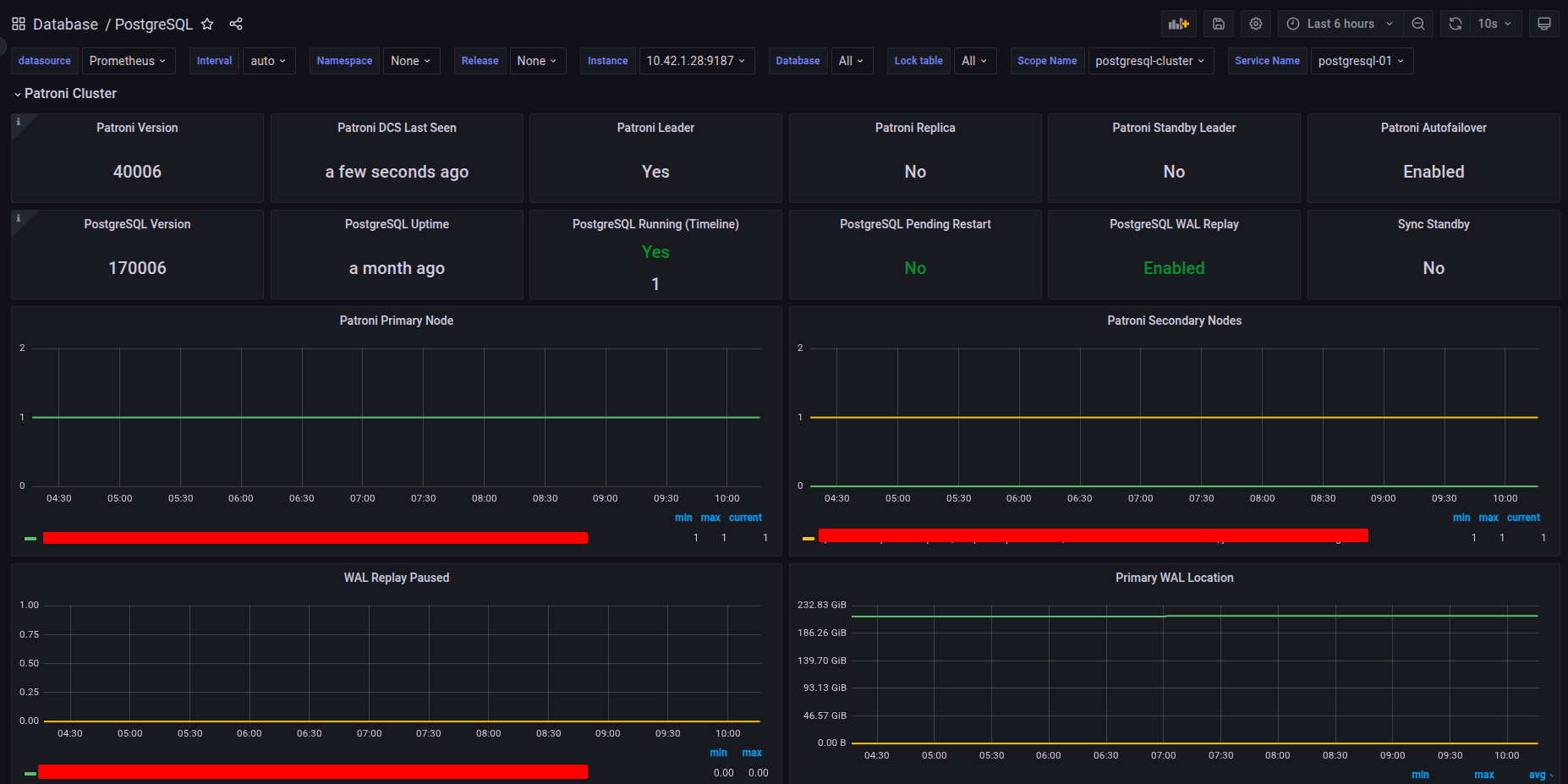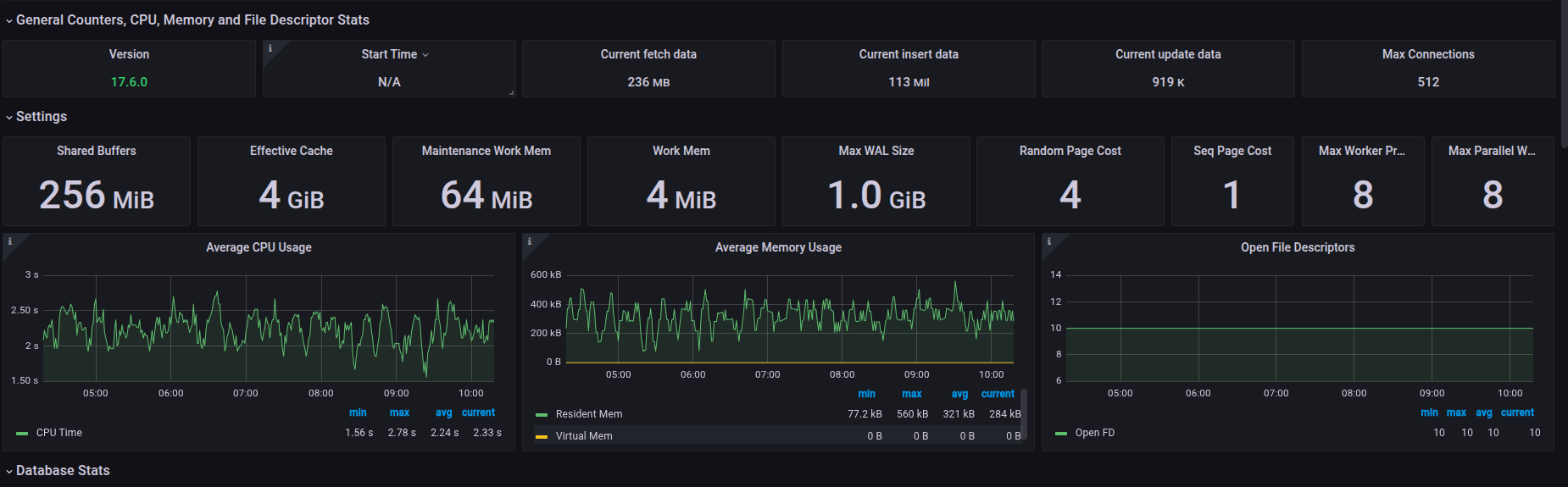 With PostgreSQL, I try also the PostgreSQL Database dashboard but, it customize it for the addition part of Patroni Cluster. Check more about fully json dashboard at PostgreSQL and Patroni Metrics Dashboard, you can easier import these dashboard in your Grafana