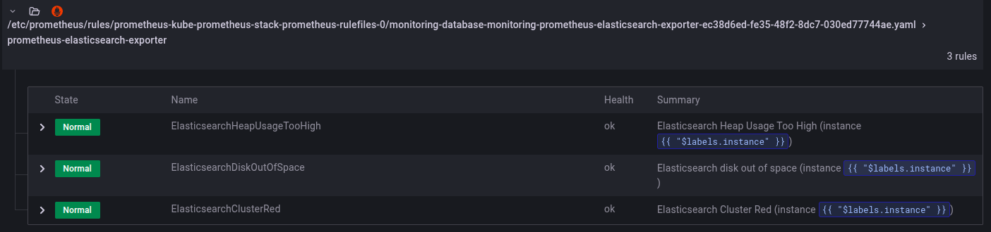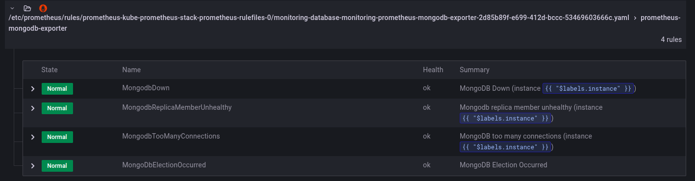 description: "A replica set election just occurred on instance {{`{{ \"$labels.instance\" }}`}} in replica set {{`{{ \"$labels.rs_nm\" }}`}}. The new primary will be elected shortly."Alright, you are able to setup MongoDB Exporter, but I will guide this one after we setup also OpenSearch (ElasticSearch) exporter