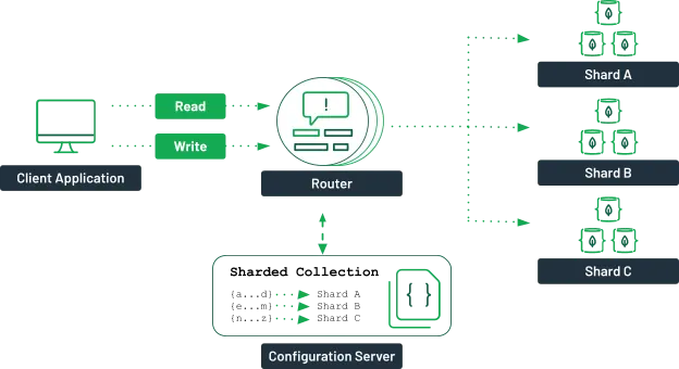 mongosrouter receives and processes the initial read or write request from the client application. - Consult Config Servers: It then checks the Config Servers (which store the clusterβs metadata) to determine the location of the relevant data blocks and the shard key range responsible for that query.
