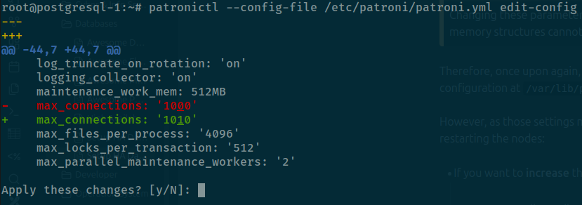 # List configuration of cluster sudo patronictl -c /etc/patroni/patroni.yml show-config# Edit the configuration of clustersudo patronictl -c /etc/patroni/patroni.yml edit-config