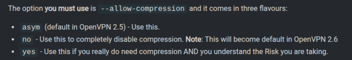 openvpn3 config-manage --config config-name --allow-compression asym# Show the configurationopenvpn3 config-manage --config config-name --show