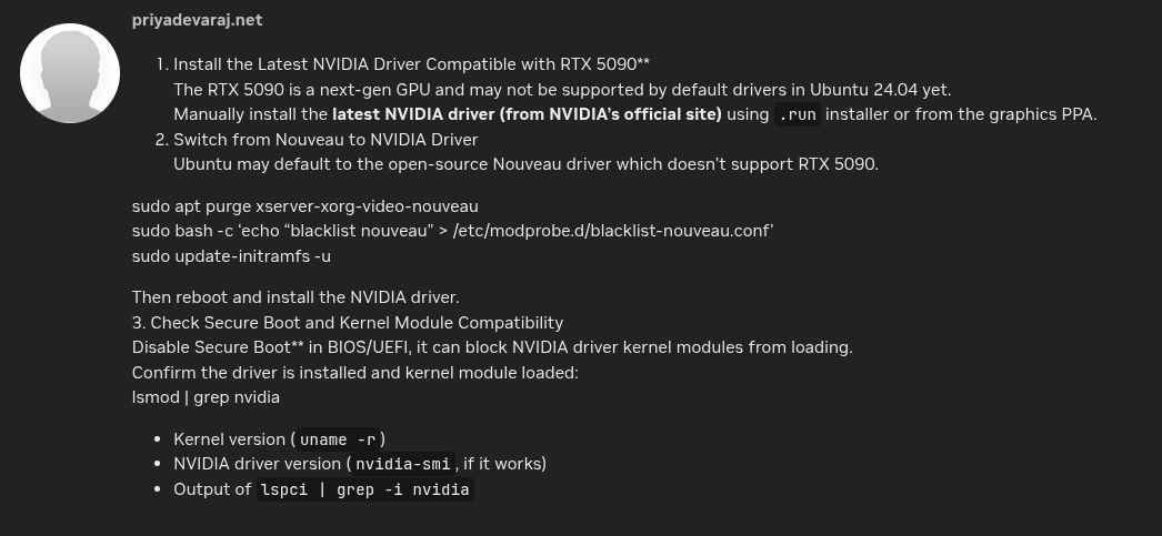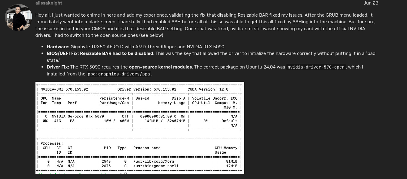 Following this discusstion from Nvidia Forum - NVIDIA RTX 5090 Not Detected by nvidia-smi on Ubuntu Server 24.04, you next action to remediation this freaky bug, including