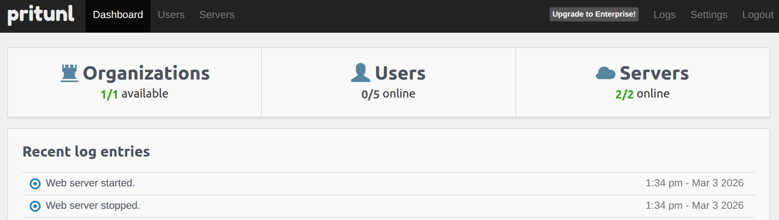 sudo pritunl setup-keyTo get the password for first time, you can use command below, and itโs able to change it in Web Dashboard after that.