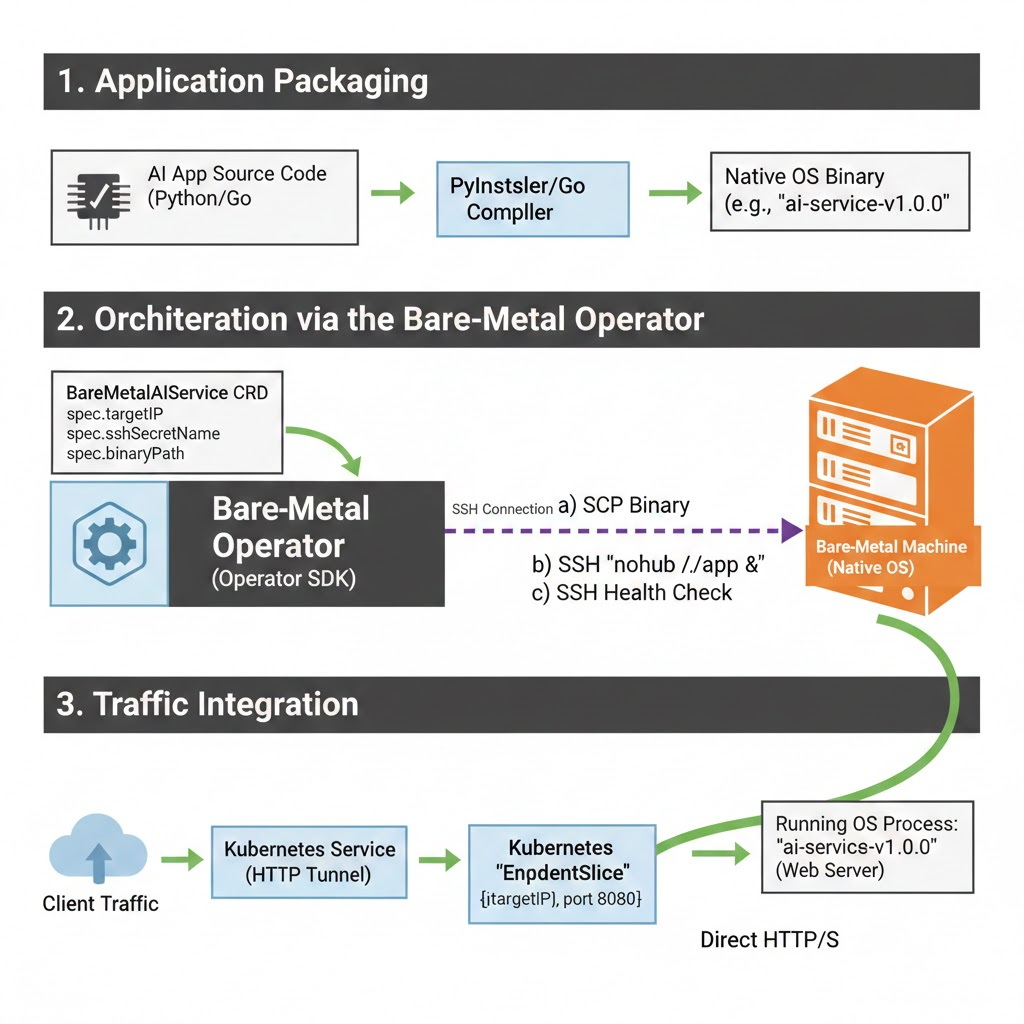 BareMetalAIServiceCRD, which specifies the target bare-metal machine IP and SSH Secret. - Via SSH, the Operator performs SCP to push the self-contained application binary.